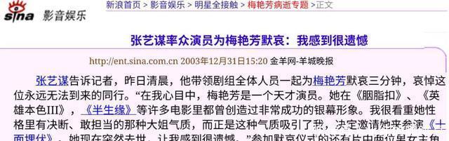 但世事无常,同年梅艳芳罹患癌症的消息就传了出来。 网友们在心疼梅艳芳遭遇的同时,也认为《十面埋伏》的合作是要泡汤了,张艺谋要另寻人选。 在得知消息的第一时间,张艺谋表示一定会等梅艳芳归来,还亲自为她修改剧本,将打戏尽量改成文戏,并且还安排了私人飞机来往香港和剧组。 令人遗憾的是,梅艳芳于2003年12月30日病逝,永久地离开了这个世界。